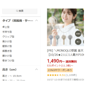 楽天市場で「ハンディファン」で検索すると左側にこのような種類が出ています。